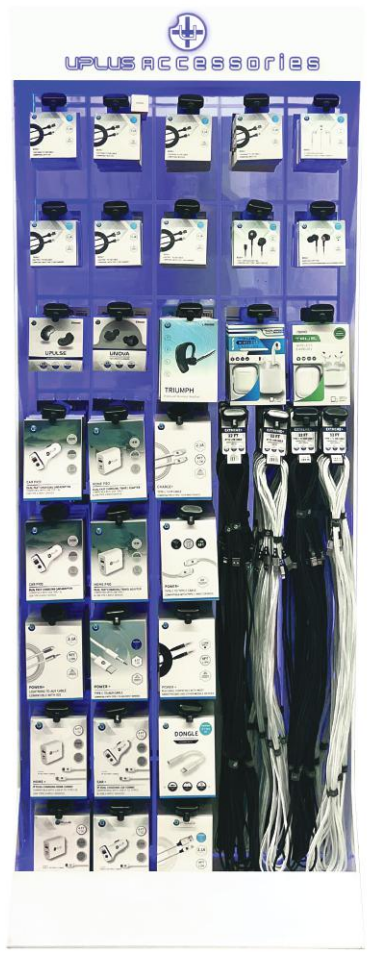 U-Plus Accessories Display refers to the retail merchandising display solutions offered by uPlus Accessories, a brand that sells mobile device accessories including chargers, cables, wireless earbuds, screen protectors, mounts, and adapters.