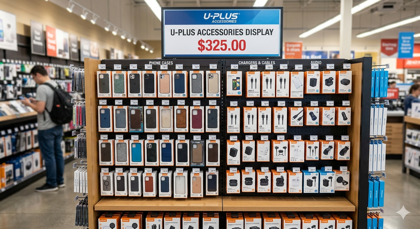 U-Plus Accessories Display refers to the retail merchandising display solutions offered by uPlus Accessories, a brand that sells mobile device accessories including chargers, cables, wireless earbuds, screen protectors, mounts, and adapters.